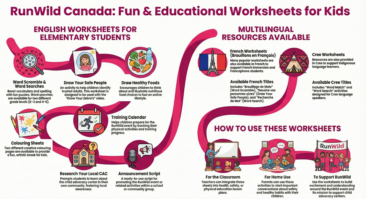 Welcome to our worksheet page! All worksheets can be printed and used at home or in the classroom to help supplement learning about your local child advocacy centre and RunWild!